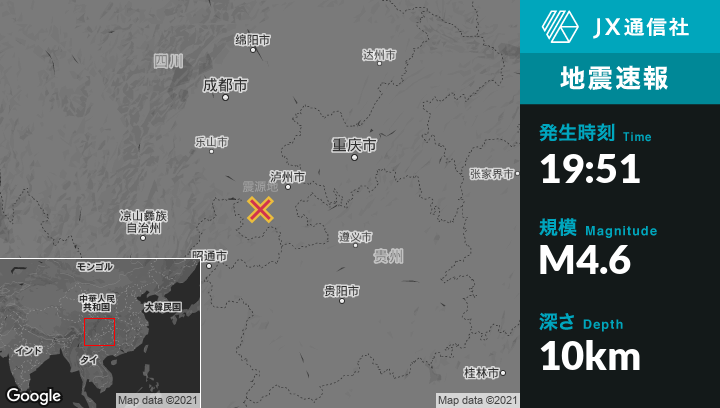 11月21日 19:51頃、中国のXunchangから北東13kmの地点でM4.6の地震がありました。