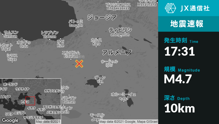11月22日 17:31頃、トルコのKarayazıから西北西25kmの地点でM4.7の地震がありました。