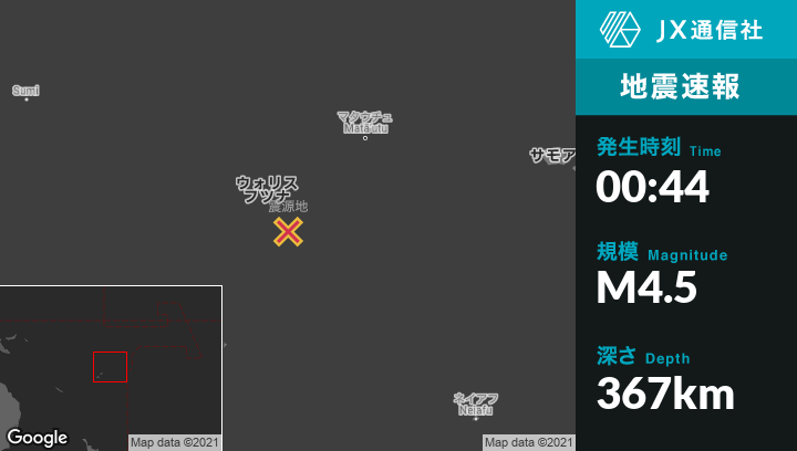 11月23日 00:44頃、ウォリス・フツナのAloから南南東83kmの地点でM4.5の地震がありました。