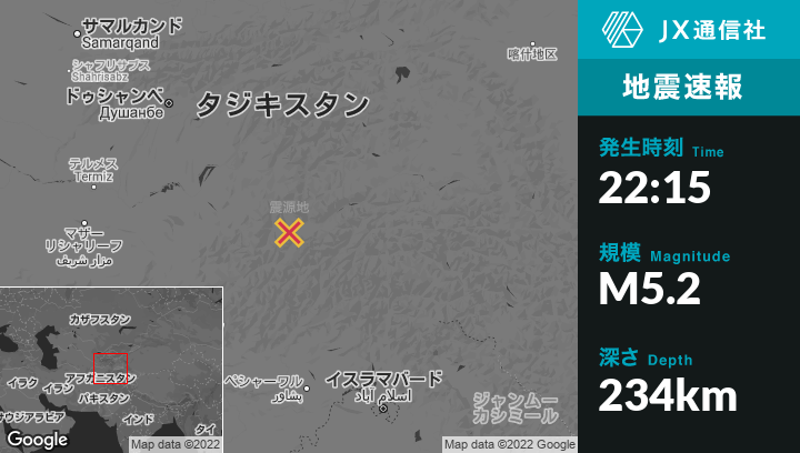 1月01日 22:15頃、アフガニスタンのAshkāshamから西32kmの地点でM5.2の地震がありました。