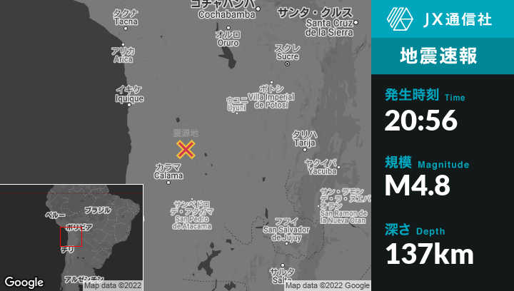 | 震源地 | チリのCalamaから北北東130kmの地点 |