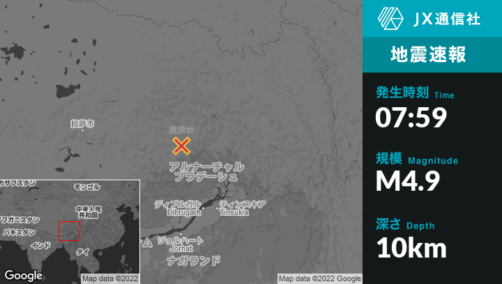 1月18日 07:59頃、インドのShi Yomiから北88kmの地点でM4.9の地震がありました。