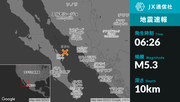 1月22日 06:26頃、メキシコのBahía de Lobosから南南西85kmの地点でM5.3の地震がありました。
