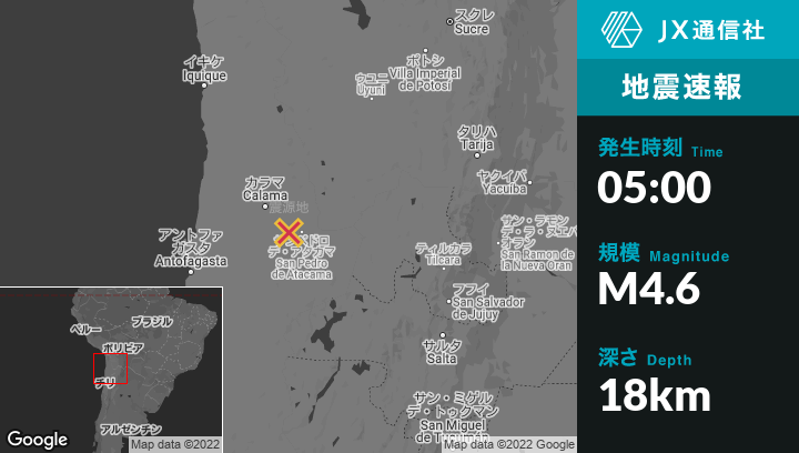 | 震源地 | チリのSan Pedro de Atacamaから西北西29kmの地点 |