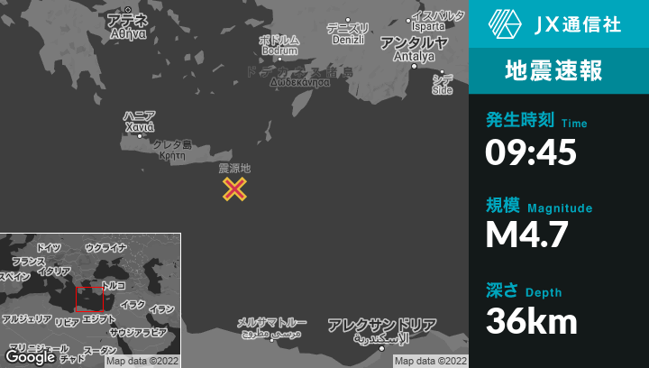 1月23日 09:45頃、ギリシャのPalekastroから南70kmの地点でM4.7の地震がありました。