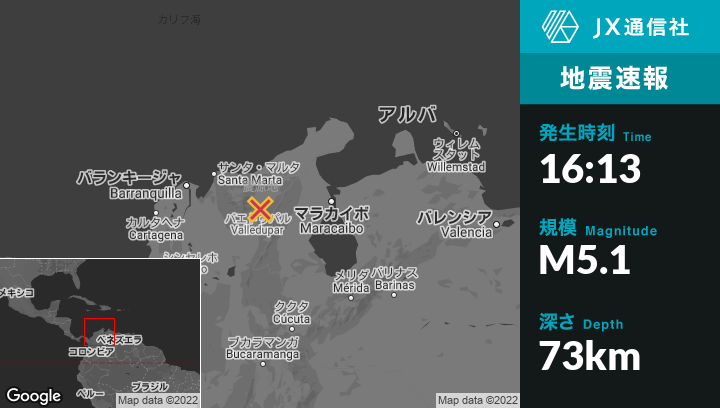 2月06日 16:13頃、コロンビアのValleduparから北北東15kmの地点でM5.1の地震がありました。