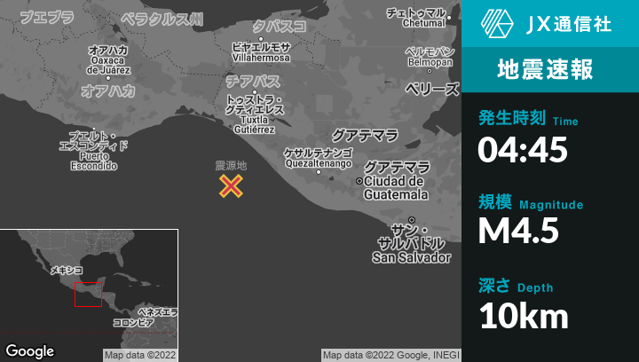 3月25日 04:45頃、メキシコのLa Esperanza (El Zapotal)から南南西107kmの地点でM4.5の地震がありました。