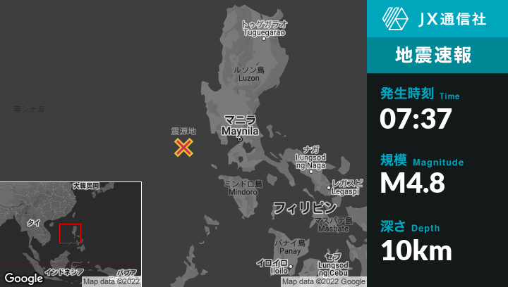 3月25日 07:37頃、フィリピンのSan Nicolasから西南西105kmの地点でM4.8の地震がありました。
