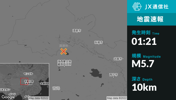 | 震源地 | 中国のLaojunmiaoから南南西147kmの地点 |