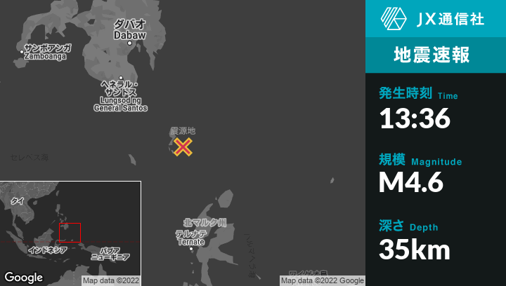 3月30日 13:36頃、フィリピンのSaranganiから南東233kmの地点でM4.6の地震がありました。