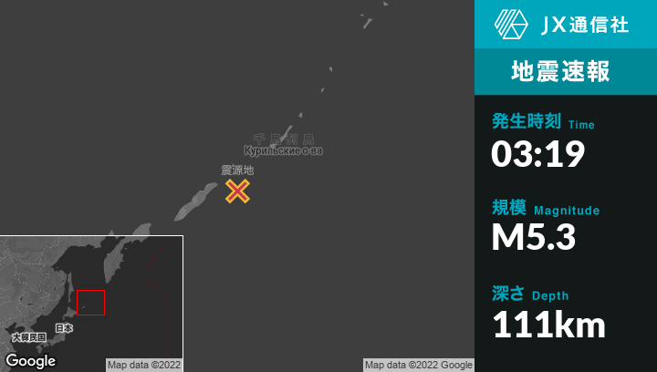 4月01日 03:19頃、ロシアのKuril’skから東北東261kmの地点でM5.3の地震がありました。