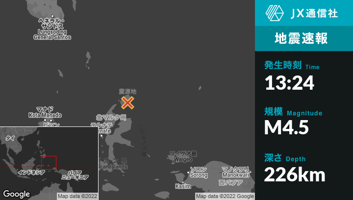 | 震源地 | インドネシアのTobeloから北東92kmの地点 |