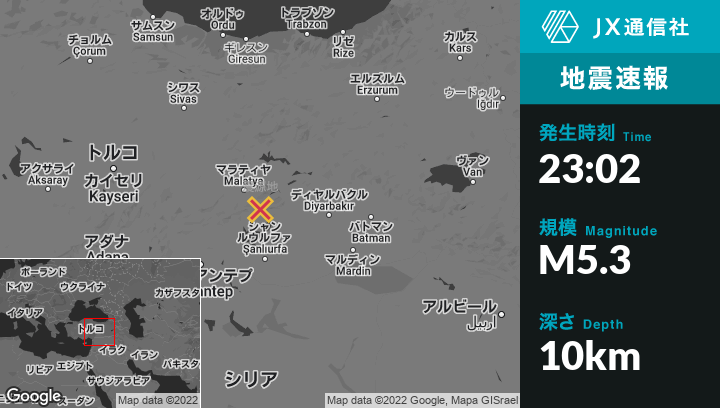4月09日 23:02頃、トルコのSincikから北東12kmの地点でM5.3の地震がありました。
