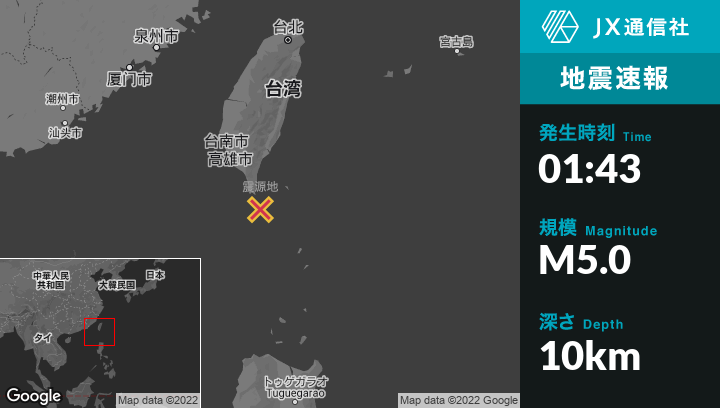 4月10日 01:43頃、台湾のHengchunから南東39kmの地点でM5.0の地震がありました。