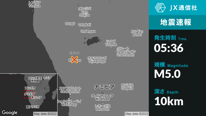 | 震源地 | ナミビアのKhorixasから北36kmの地点 |