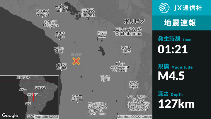 4月14日 01:21頃、チリのIquiqueから北東146kmの地点でM4.5の地震がありました。