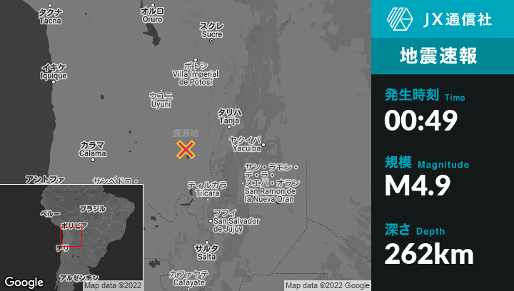 4月15日 00:49頃、ボリビアのVillazónから西49kmの地点でM4.9の地震がありました。