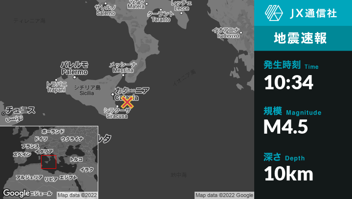 4月15日 10:34頃、イタリアのAugustaから東46kmの地点でM4.5の地震がありました。