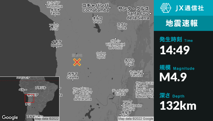 4月15日 14:49頃、チリのCalamaから北北東152kmの地点でM4.9の地震がありました。