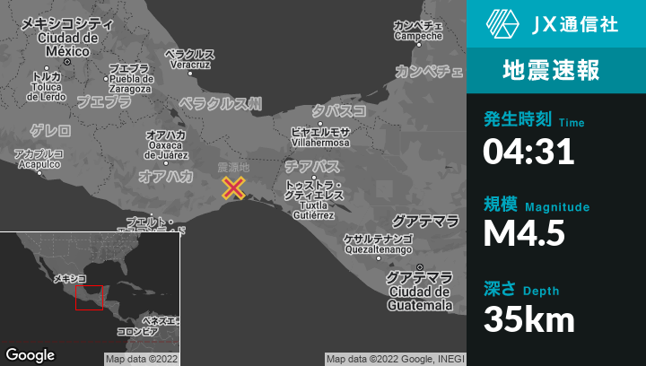 4月18日 04:31頃、メキシコのIxtepecから北北東7kmの地点でM4.5の地震がありました。