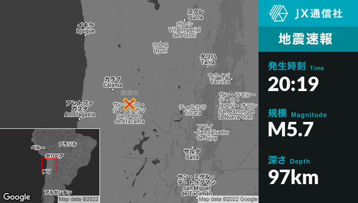 | 震源地 | チリのSan Pedro de Atacamaから南2kmの地点 |