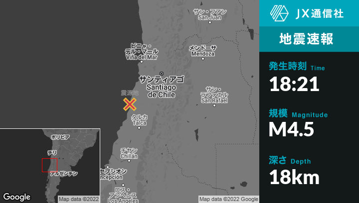 4月30日 18:21頃、チリのSanta Cruzから西北西67kmの地点でM4.5の地震がありました。