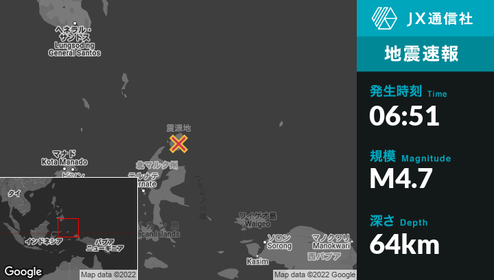 | 震源地 | インドネシアのTobeloから北東91kmの地点 |