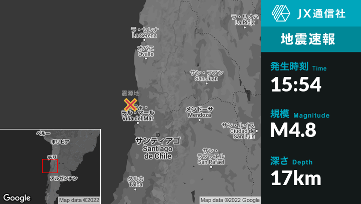 5月04日 15:54頃、チリのLa Liguaから西北西65kmの地点でM4.8の地震がありました。
