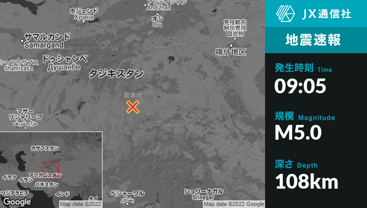 5月05日 09:05頃、タジキスタンのKhorughから東16kmの地点でM5.0の地震がありました。