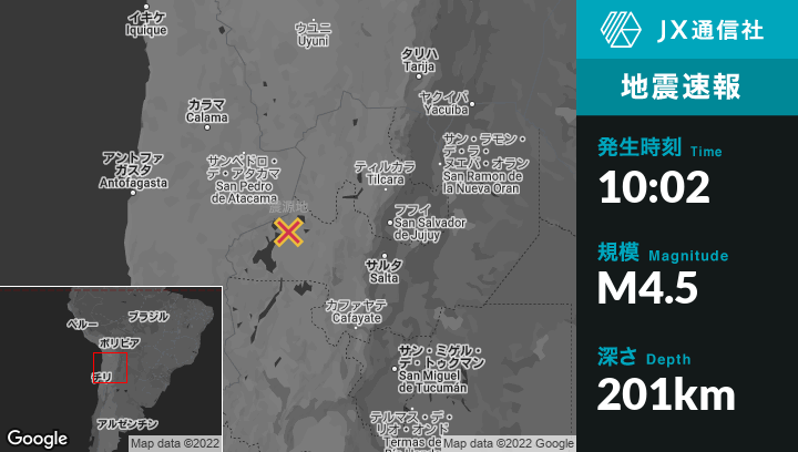 | 震源地 | アルゼンチンのSan Antonio de los Cobresから西102kmの地点 |