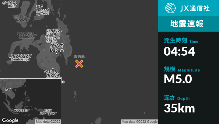 5月06日 04:54頃、フィリピンのLukatanから東南東85kmの地点でM5.0の地震がありました。