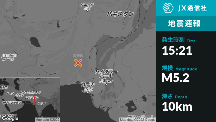 5月06日 15:21頃、パキスタンのBelaから北79kmの地点でM5.2の地震がありました。