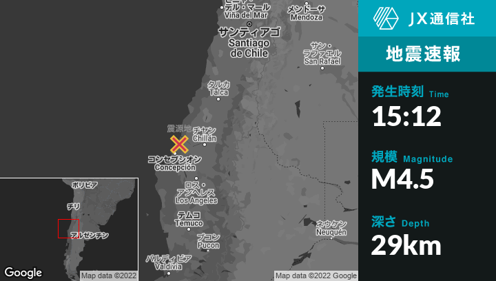 5月07日 15:12頃、チリのToméから北北東14kmの地点でM4.5の地震がありました。