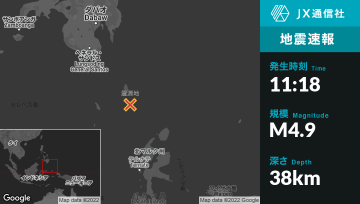 5月08日 11:18頃、フィリピンのSaranganiから南東245kmの地点でM4.9の地震がありました。