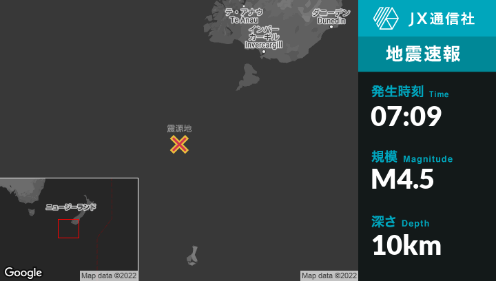 | 震源地 | ニュージーランドのBluffから南西278kmの地点 |