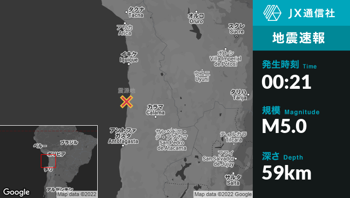 5月12日 00:21頃、チリのTocopillaから北42kmの地点でM5.0の地震がありました。