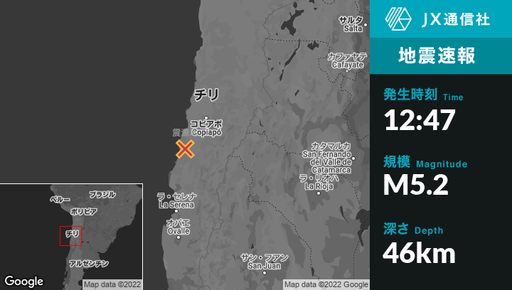 5月24日 12:47頃、チリのVallenarから北北西56kmの地点でM5.2の地震がありました。