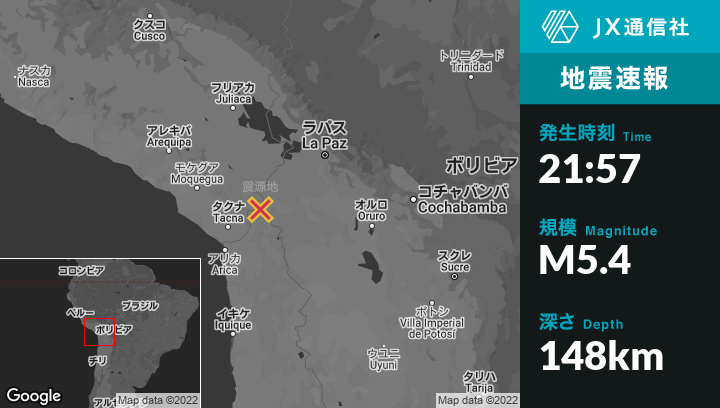 5月24日 21:57頃、ペルーのEstiqueから東49kmの地点でM5.4の地震がありました。