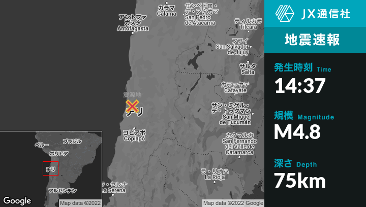 5月27日 14:37頃、チリのDiego de Almagroから西37kmの地点でM4.8の地震がありました。