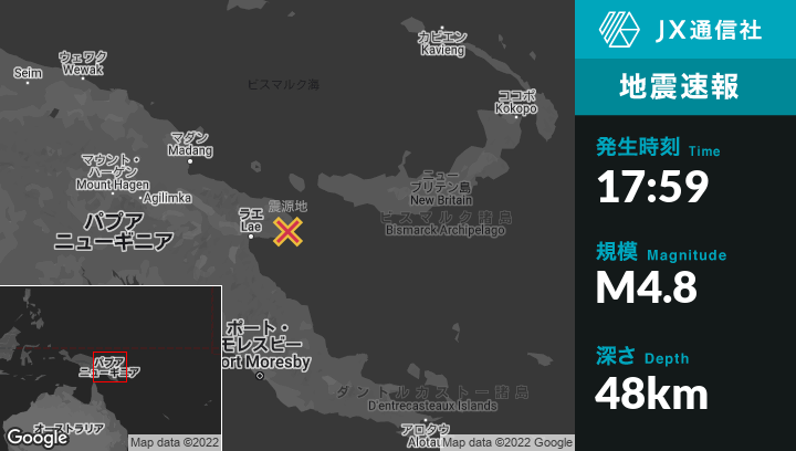 5月29日 17:59頃、パプアニューギニアのFinschhafenから西北西16kmの地点でM4.8の地震がありました。