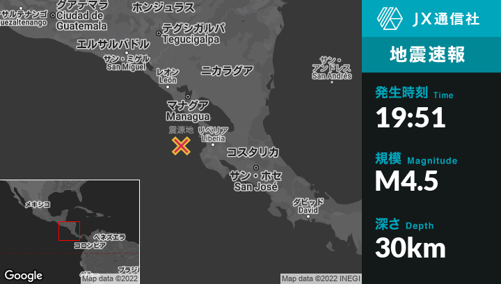 | 震源地 | ニカラグアのSan Juan del Surから南西87kmの地点 |