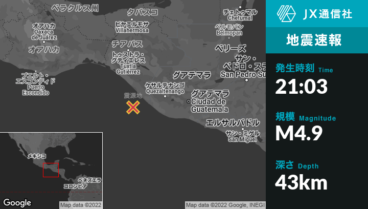 | 震源地 | メキシコのPuerto Maderoから西南西56kmの地点 |