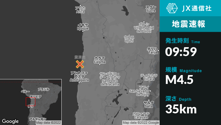 5月30日 09:59頃、チリのTocopillaから南西29kmの地点でM4.5の地震がありました。