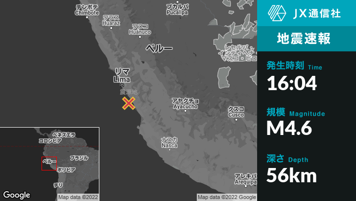 5月30日 16:04頃、ペルーのMalaから西南西15kmの地点でM4.6の地震がありました。