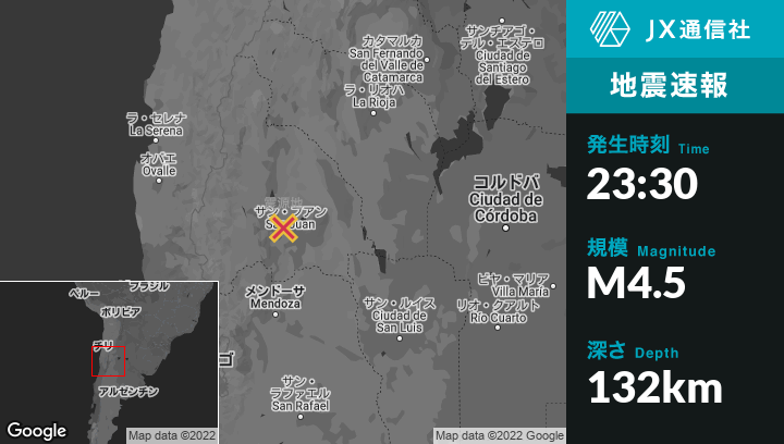 5月30日 23:30頃、アルゼンチンのAlbardónから北西21kmの地点でM4.5の地震がありました。