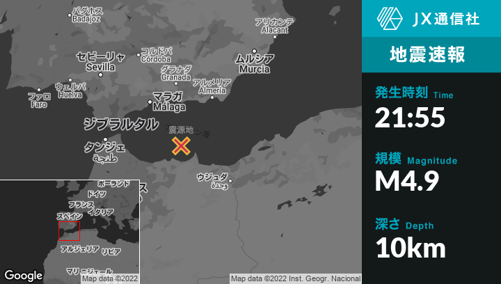 6月02日 21:55頃、スペインのMelillaから北西64kmの地点でM4.9の地震がありました。