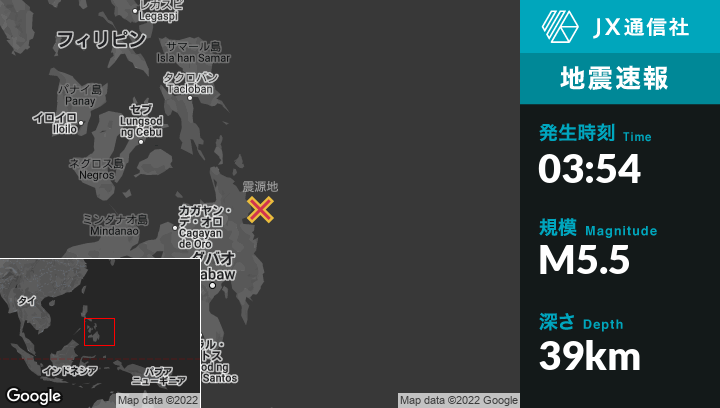 6月03日 03:54頃、フィリピンのAras-asanから東北東21kmの地点でM5.5の地震がありました。
