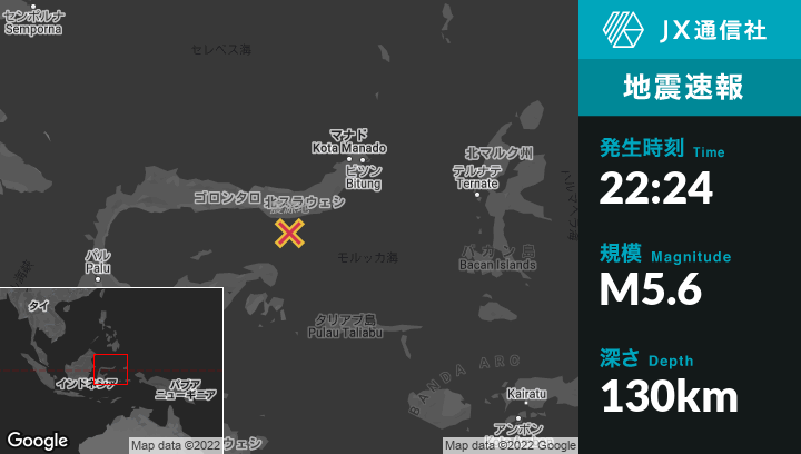 6月07日 22:24頃、インドネシアのGorontaloから南東79kmの地点でM5.6の地震がありました。
