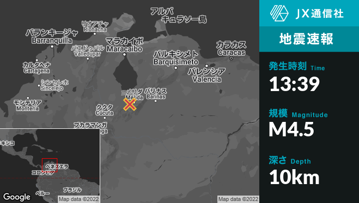 6月08日 13:39頃、ベネズエラのEjidoから西北西17kmの地点でM4.5の地震がありました。