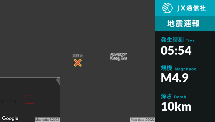 6月10日 05:54頃、チリのHanga Roaから西297kmの地点でM4.9の地震がありました。